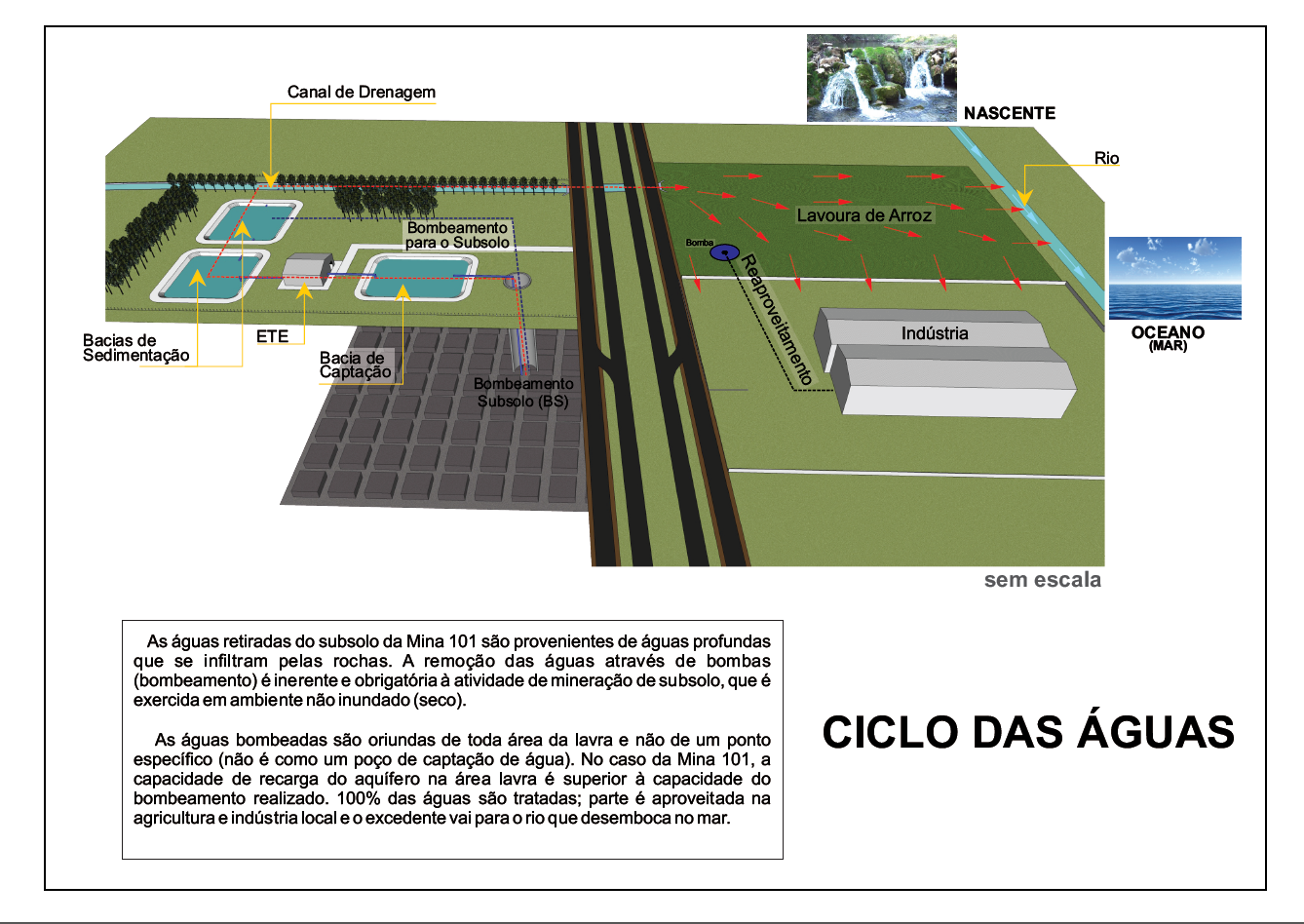 Na Unidade de Extração Mina 101, como a área do entorno é constituída por plantações de arroz, a Rio Deserto passou a contribuir com a agricultura, beneficiando as plantações, bem como a indústria local, por meio da disponibilização de água tratada proveniente da mineração. A unidade possui ampla rede de monitoramento hídrico contemplando pontos superficiais, subterrâneos, bombeamento da mina com controles de vazão, nível potenciométrico e de qualidade.